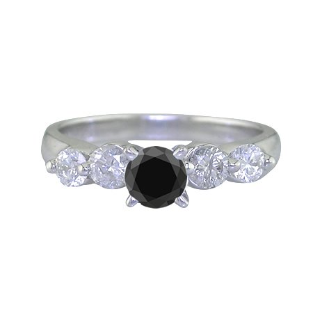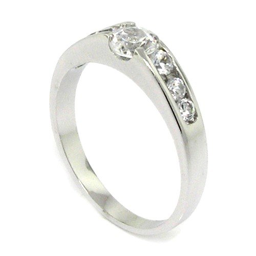 Crafted in a style that endures, this ring says: "Love is here to stay"! The center stone is a round Brilliant measuring 5mm in diameter (= approx. 1/2 carat. Three channel-set small Brilliant CZs, in graduated sizes, adorn each shoulder. All stones are White Diamond CZs. The total weight is equivalent to almost 3/4carat. The high polish band tapers down to 2mm at the back.