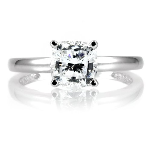 * Designer inspired 1.5 CT cushion cut CZ engagement ring is an instant classic! * Medium width sterling silver band is rhodium plated for shine and durability. * 1.5 carat faux diamond CZ has a stunning cushion cut and is prong set on the band. * High quality CZ and small carat size make this a totally believable fake diamond ring! * Also available with a smaller 1 carat center stone! Weight: Approx 2.3 g Metal: .925 sterling silver jewelry Stone: Cubic Zirconia Cut: Cushion cut jewelry Carat: Cushion cut CZ approx 1.5 carats (6.5mm) Measures: .27in (7mm) x .27in (7mm) x .27in (7mm) bezel, Band width: .08in (2mm) Color: Diamond clear hued jewelry